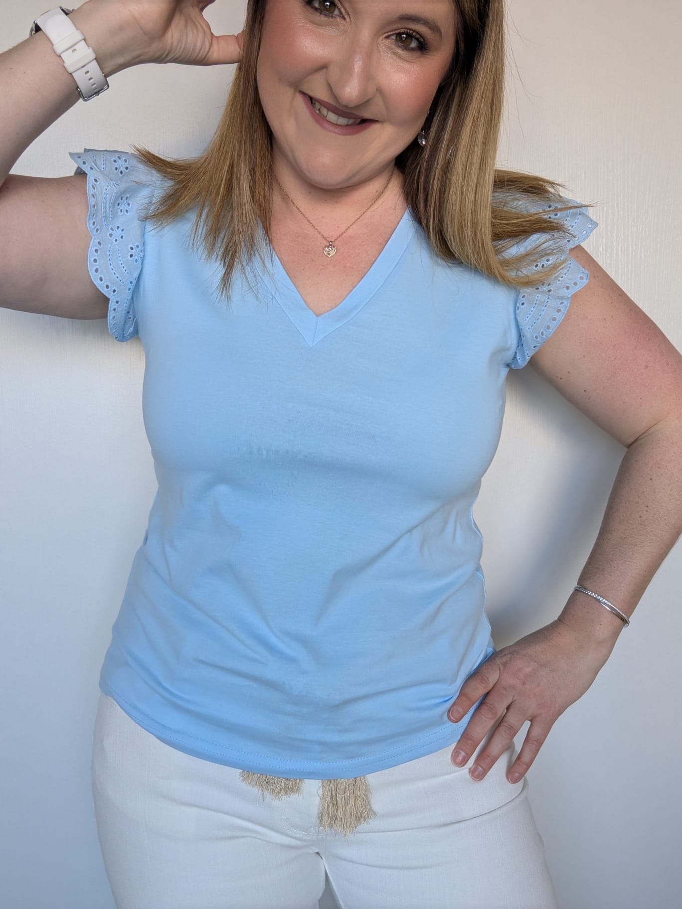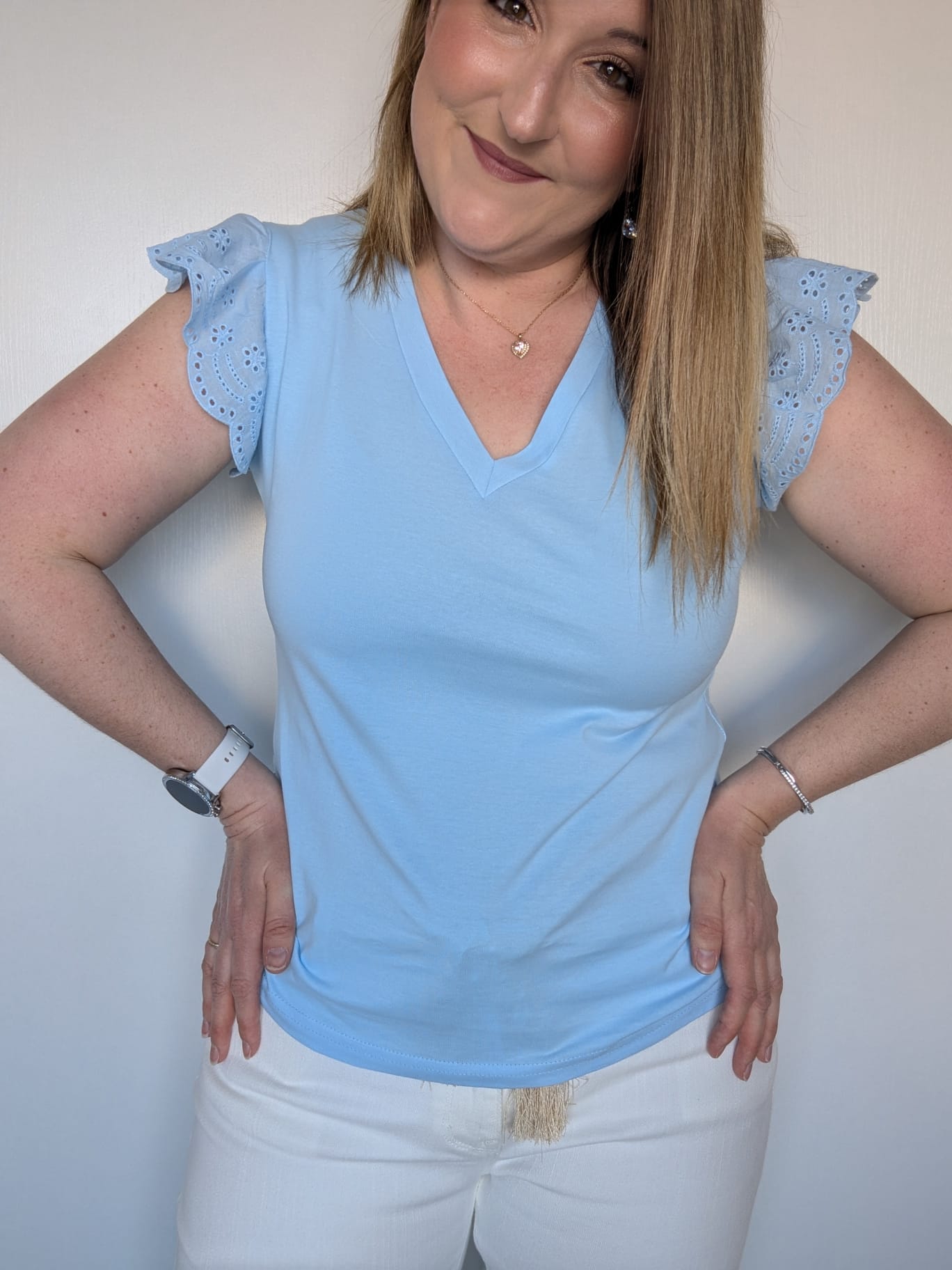 Col en V, manches courtes, manches en broderie, coupe droite.